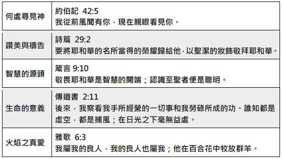 而聖經中的智慧五卷一般是指:約伯記、詩篇、箴言、傳道書、雅歌。以下列出大多學者認定的關鍵經文,希望你在閱讀過程中也能找出感動你的經文。