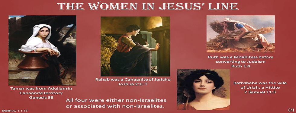 耶穌家譜中所列出的女性都各有故事,配合教會的舊約讀經,也略略理解這幾位女性的特別之處: